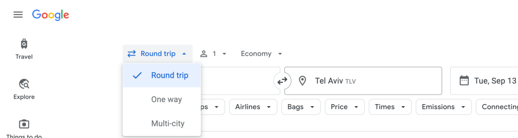 חשוב לציין שנוודים דיגיטלים תמיד קונים כרטיס בכיוון אחד. אין טעם לבזבז אנרגיה על מנת לחזור לאותה נקודת מוצא. כדי לעשות את זה בחיפוש טיסה עליכם לבחור באופצייה הזאת. מצרף כאן למטה דוגמא איך נראית האפשרות באתר Google Flights.