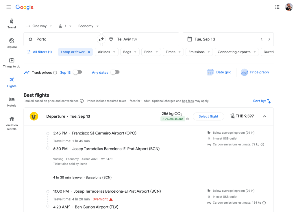 אז שהבנתי את הסיטואציה, חיפשתי טיסה מפורטו – לתל אביב, החיפוש הזה היה ב-9.2.22. ישמע לכם אולי מוזר אבל בתקופה הזו לפני חצי שנה כמעט אף אחד לא טס בישראל, אנשים עדיין חששו מהקורונה. וזה אומר שבכללי היו הרבה פחות אפשרויות טיסה לישראל ובכלל היו עדיין הרבה פחות טיסות בכללי בעולם.