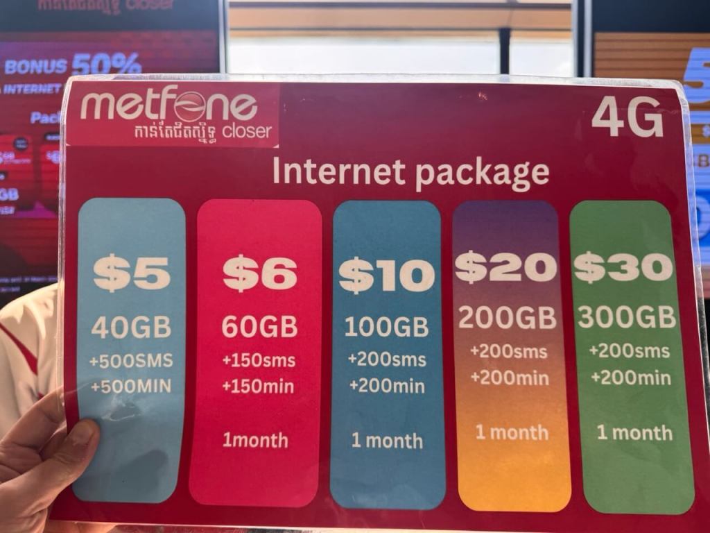 - Metfone: החברה שבה אני השתמשתי. ברוב הזמן הייתה מצוינת, למעט רגעים בודדים שהאינטרנט "קפא" ונאלצתי להעביר למצב טיסה כדי לרענן את הרשת.