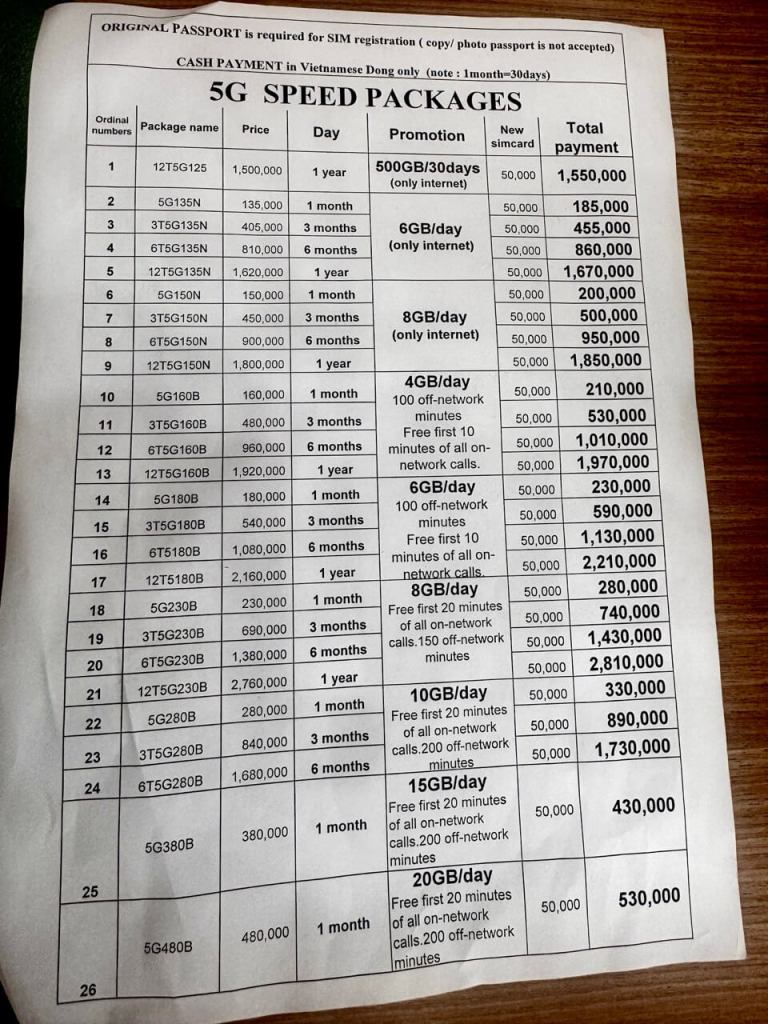 ההמלצה שלי: לכו לחנות רשמית של Viettel. זו החברה הכי אמינה בווייטנאם. תוכלו לרכוש שם חבילה לשבוע ועד שנה מראש. בביקור האחרון שלי (לשלושה חודשים), שילמתי 540,000 דונג (כ-65 ש"ח) ל-90 יום! זה כולל 6GB גלישה שמתאפסים כל יום. (מיקום חנות Viettel)